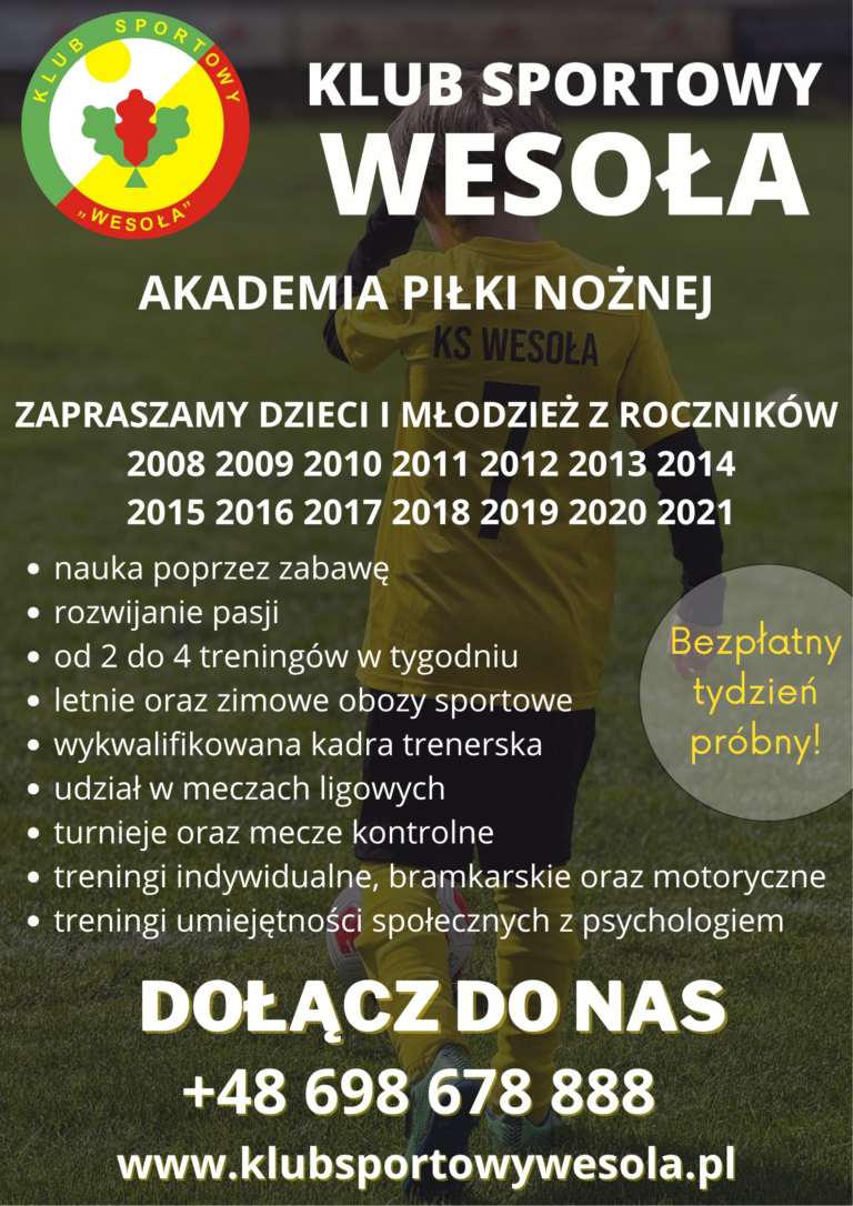 Klub Sportowy Wesoła zaprasza dzieci i młodzież urodzoną w latach 2008-2021 na treningi piłki nożnej odbywające się na terenie dzielnicy Wesoła