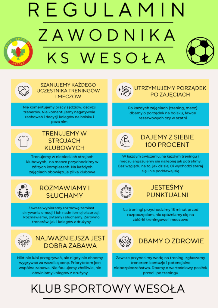 Zawarliśmy dla Was w infografice najważniejsze punkty regulaminu zawodnika Klubu Sportowego Wesoła, które są dla nas priorytetem.